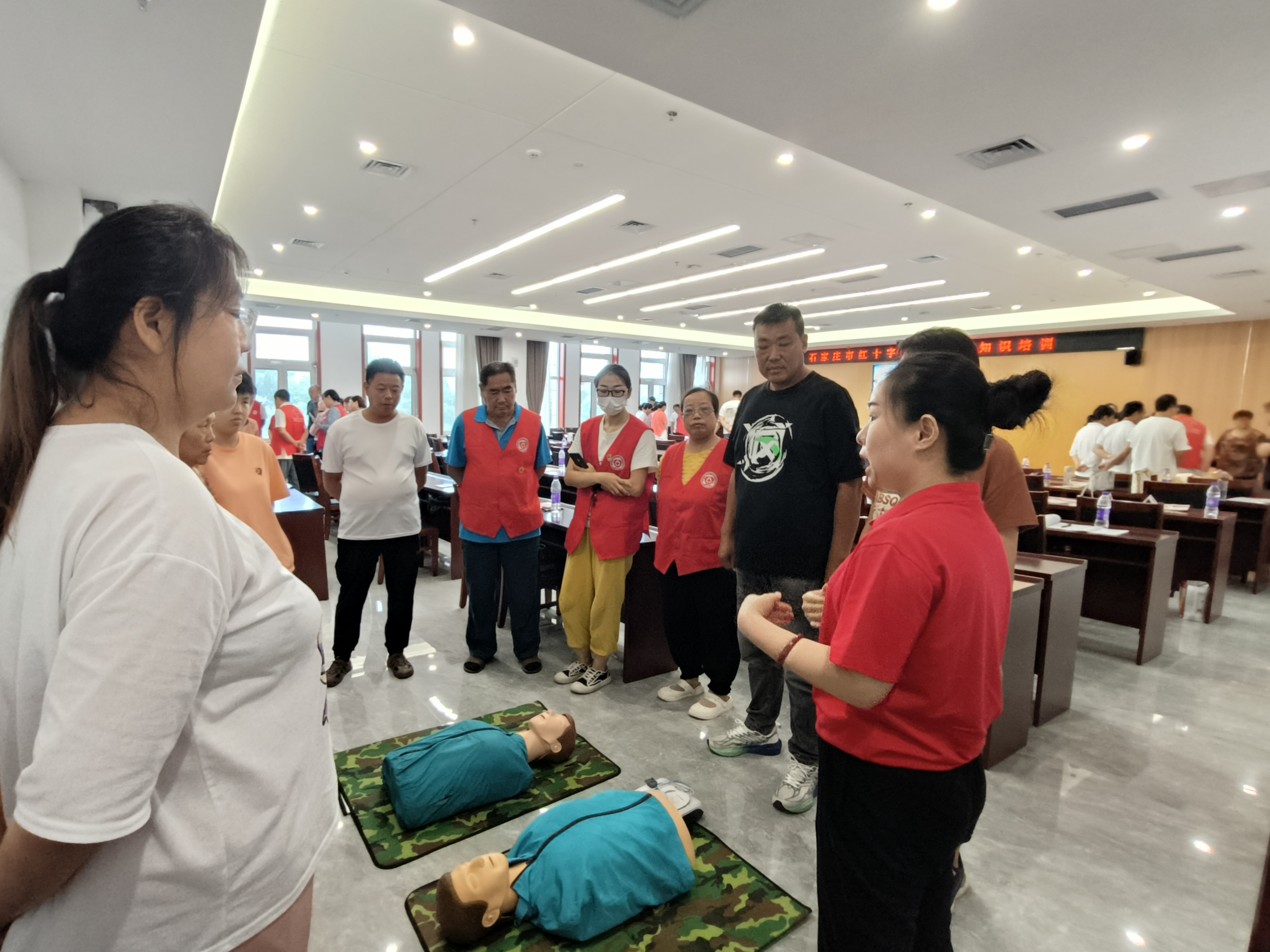 课上,讲师通过理论知识图文演讲、现场实操演练体验等形式,围绕应急救护心肺复苏CPR+AED等急救知识进行系统讲解,指导学员们进行实操。 学员们以严谨的态度和饱满的热情,认真听讲,仔细观看教学演示,互相交流操作,在老师的指导下掌握正确的应急救护方法。所有参训学员全程听课学完全部课程,经现场理论、实操考试考核,全部顺利通过并取得证书,成为一名光荣的红十字救护员。