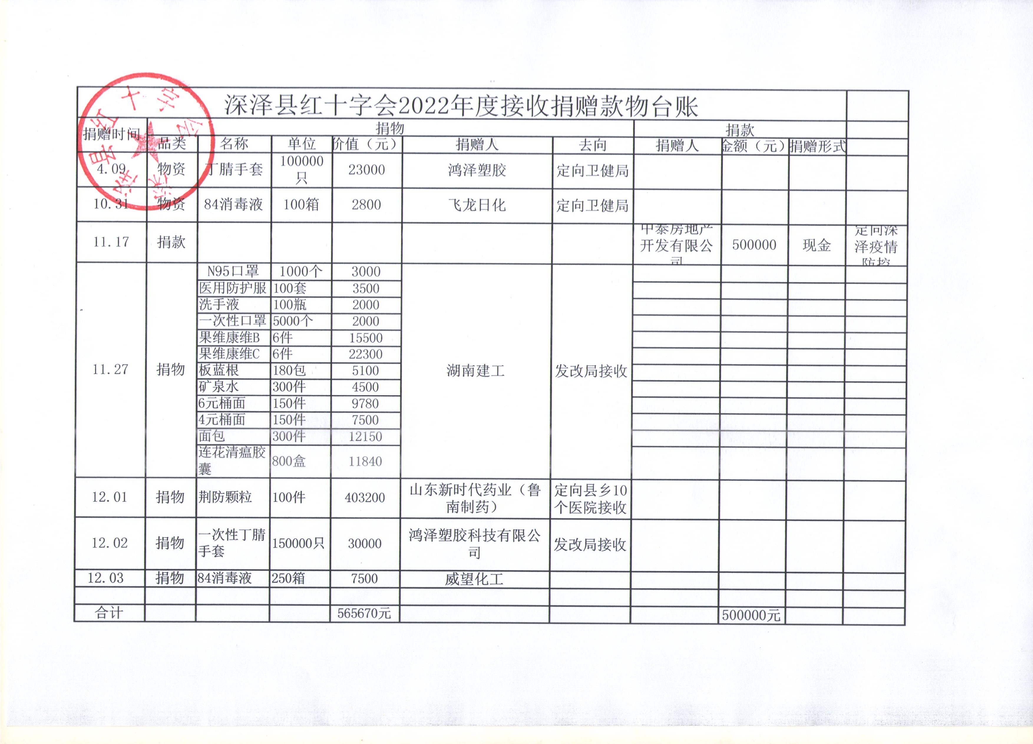 深泽县红十字会2022年接收捐赠情况公示表