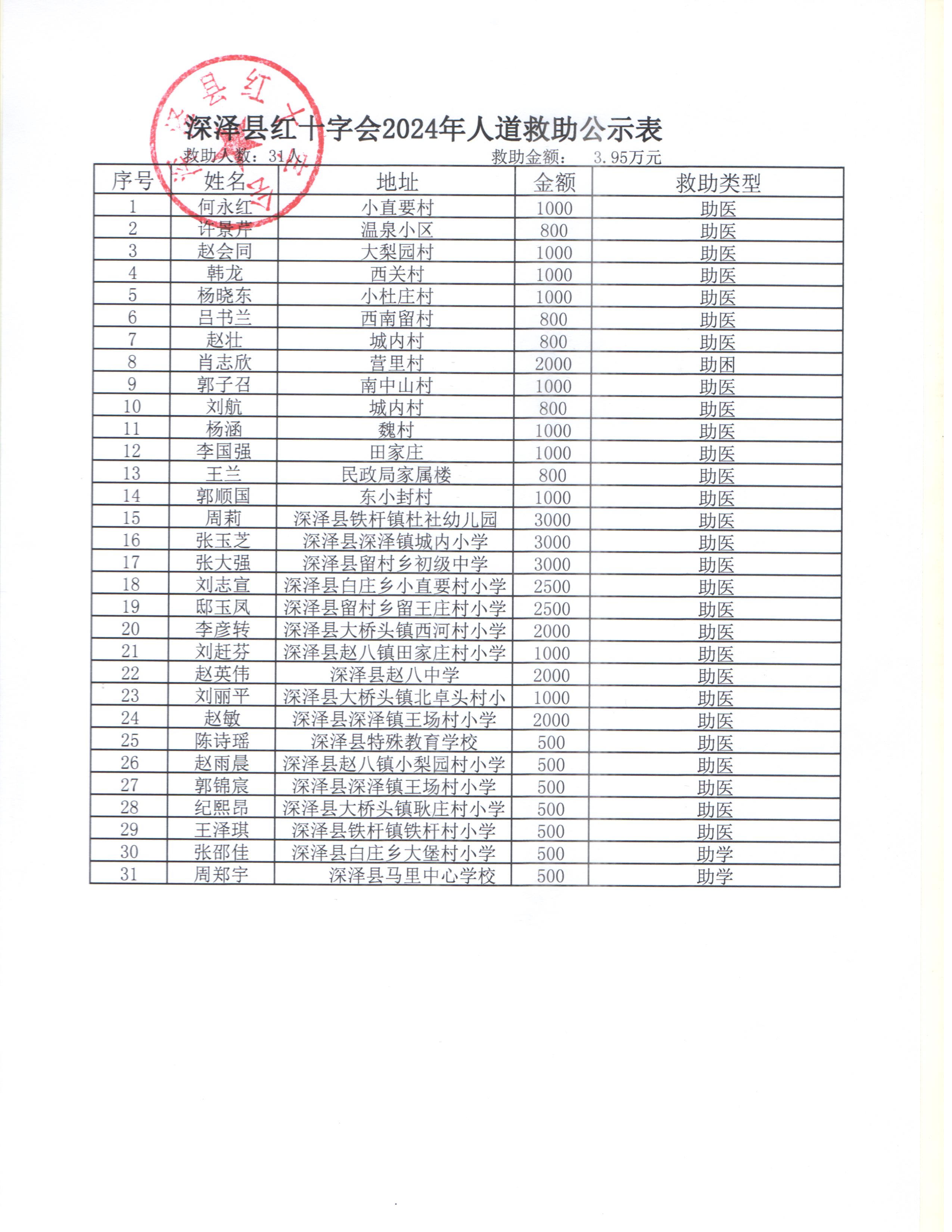 深泽县红十字会2024年人道救助公示表